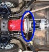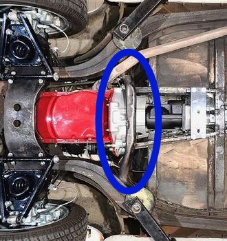 Le châssis, outre l’absence de rouille importante et profonde, ne doit pas présenter de traces de chocs, sauf éventuellement des petites "touchettes" n’ayant pas engendré de grosses déformations. Sur beaucoup de MGA, la traverse proche du carter, repérée en bleu ci-contre est souvent un peu enfoncée par endroits, signe qu’elle est judicieusement placée comme protection ! Si elle est trop enfoncée, méfiance, sur la photo ci-contre on est probablement limite (mais sur une simple photo il est difficile de se rendre compte).