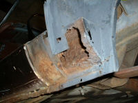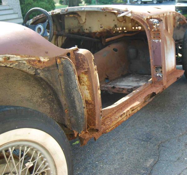 La rouille se développe particulièrement, sur la MGA, aux alentours des portières, notamment entre l’ouverture et la roue arrière. On voit ci-dessous les effets du temps, qui peuvent être assez dramatiques. La corrosion se développe aussi en bas de caisse entre le châssis et la carrosserie, l’eau étant souvent piégée à cet endroit.